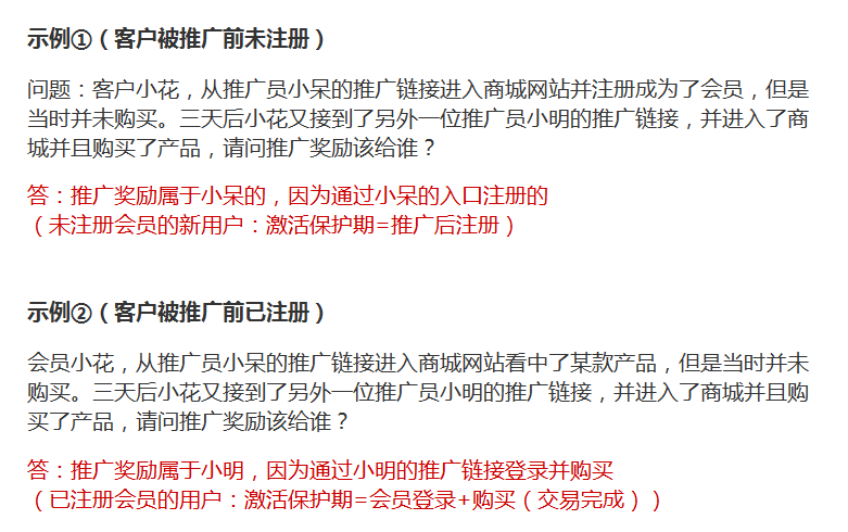 客戶保護(hù)期的定義為“當(dāng)用戶首次進(jìn)入某推廣員的鏈接/二維碼并購買產(chǎn)品或注冊(cè)成為會(huì)員時(shí),該用戶在指定的保護(hù)期內(nèi)則綁定為該推廣員的客戶,之后無論用戶去到哪里下單(其他推廣員的鏈接或者總店),推廣員都可以得到獎(jiǎng)勵(lì);當(dāng)保護(hù)期到期后,用戶再點(diǎn)擊鏈接,則保護(hù)期自動(dòng)續(xù)期,如保護(hù)期為15天,則續(xù)期15天”。