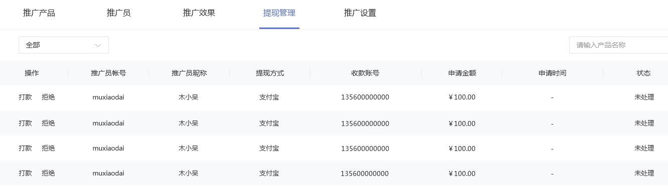 ⑥點(diǎn)擊“提現(xiàn)管理”標(biāo)簽項(xiàng),您可在此處對(duì)推廣員的提現(xiàn)申請(qǐng)進(jìn)行操作。當(dāng)提現(xiàn)方式為“商家手動(dòng)結(jié)算”的結(jié)算方式時(shí),商家需另外轉(zhuǎn)賬再到這里進(jìn)行確認(rèn)操作;當(dāng)提現(xiàn)方式為“系統(tǒng)自動(dòng)結(jié)算”的結(jié)算方式時(shí),商家只需在這里點(diǎn)擊“確認(rèn)”,系統(tǒng)自動(dòng)打款至對(duì)應(yīng)的支付寶或微信零錢賬戶中。